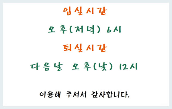 이용시간 : 입장시간부터 24시간 (외출 1회가능, 외출시 키는 카운터에 반납)
